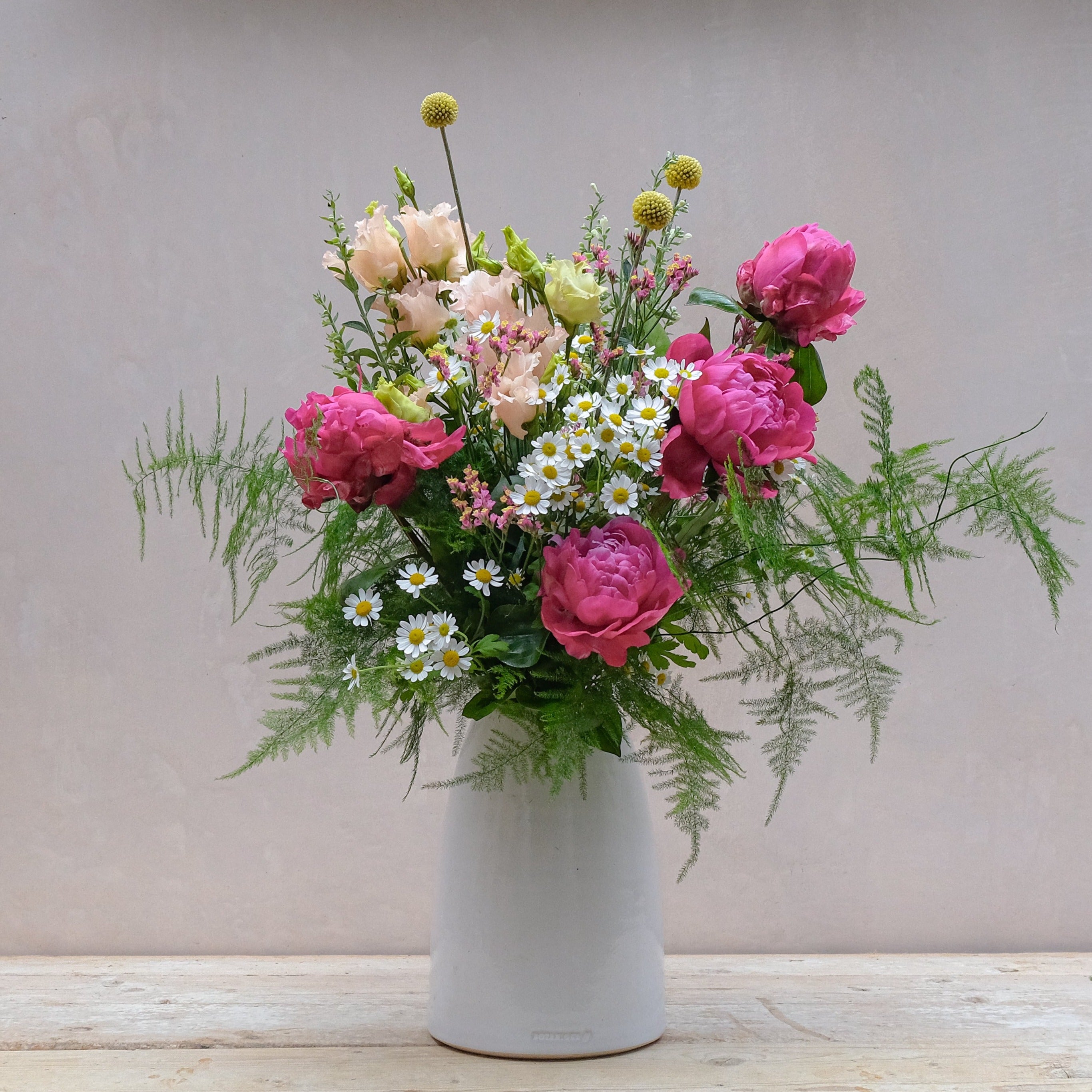 "A pocket full of peonies" pairs bright pink peony flowers with sweet daisies, lisianthus, craspedia and ferns.