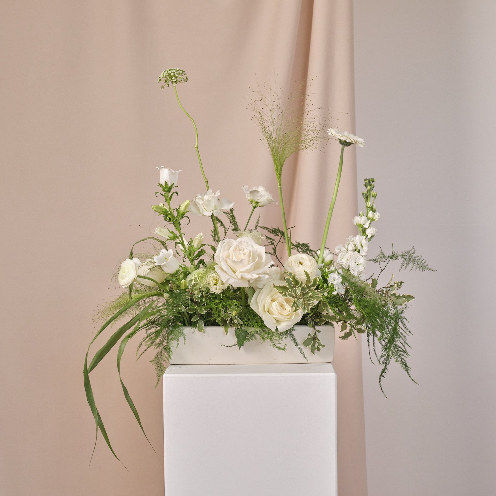 A timeless collection focusing on texture and tone. Designed to be effortlessly whimsical and floaty, we use lots of flower varieties and elements like grasses to achieve the look. The blend of different greens also makes the white flowers brighter and pop more for a cleaner, fresher look. Perfect for modern romantics who still want a touch of tradition.
