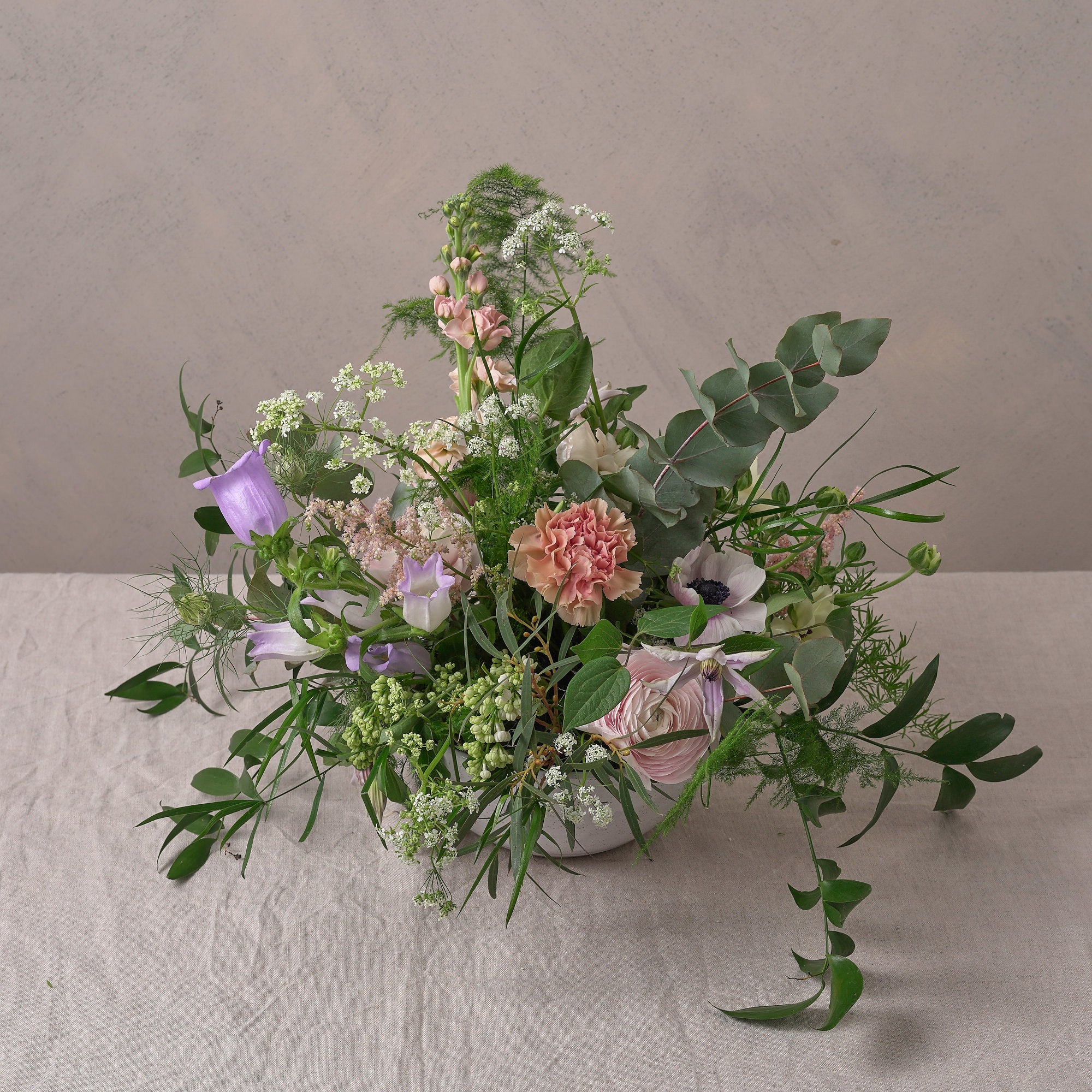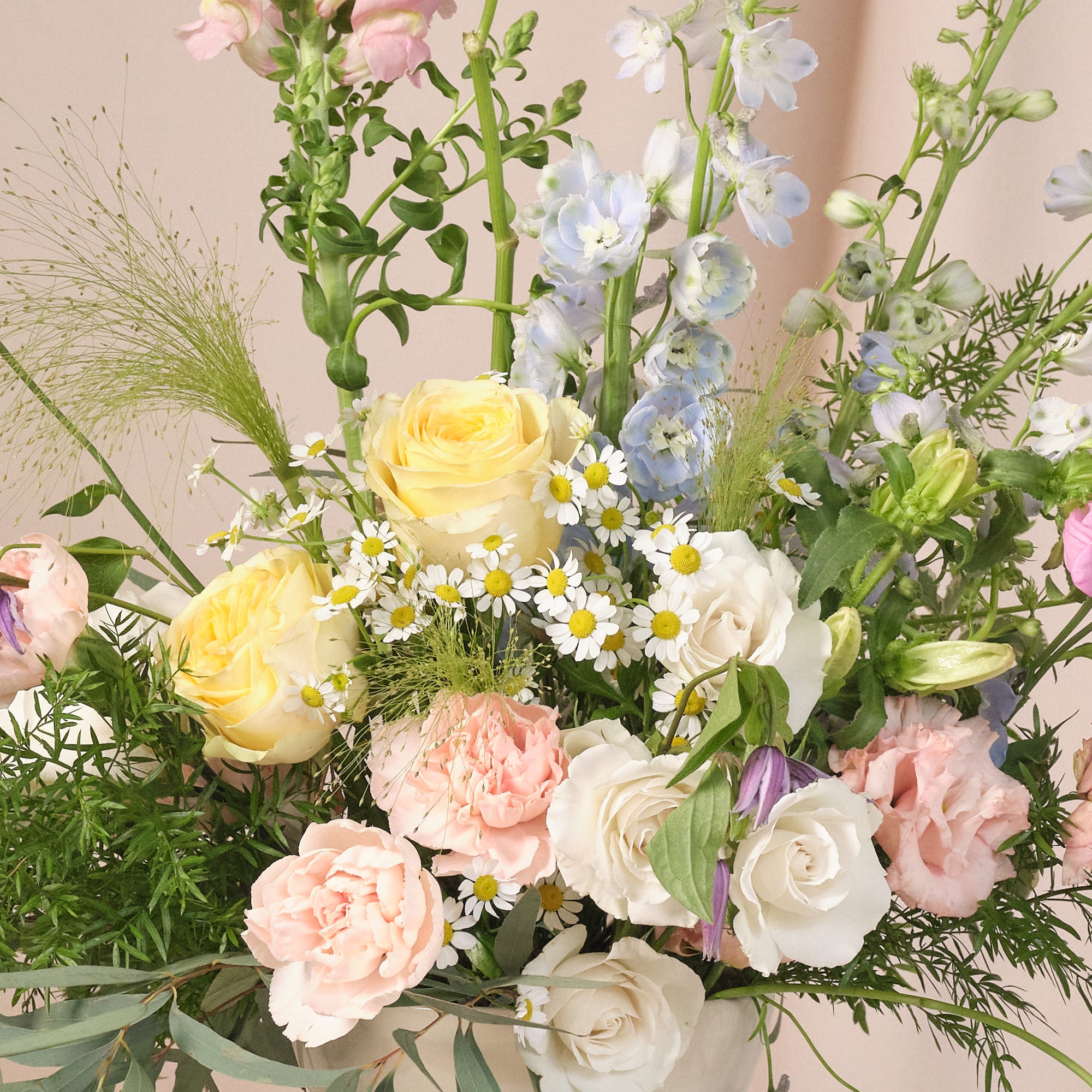 Dress up your wedding venue with our skilfully arranged bowl arrangements in a delicate pastel colour palette. These arrangements can be used to dress up pew ends, at the end of the aisle on a plinth, or at the registrars table. They can then be repurposed on dining tables as centrepieces, they look fantastic on a ledge or mantle, and also on a bar, effortlessly adding the finishing touch to your wedding venue. Blush pinks, baby blues, buttery yellows, creams and soft lilac are complemented by an abundance of fresh greenery, for a truly luxurious yet whimsical feel.