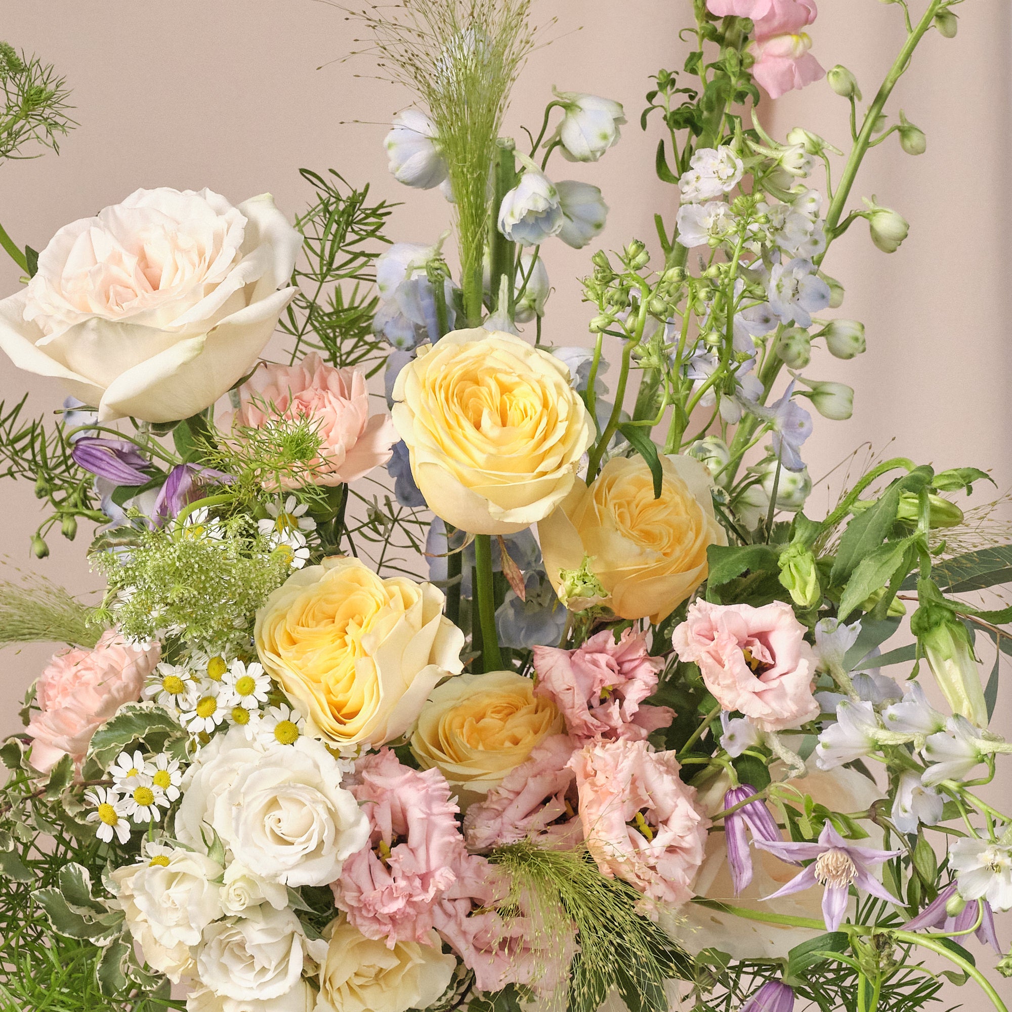 We always work with seasonal flowers, so the exact flowers you'll receive will differ slightly from those pictured. We will however stick to the colour palettes of our off-the-peg collections. Here's a handy guide on what flowers will be in season on your wedding or event date, to give you an idea of what our florists may be able to use.