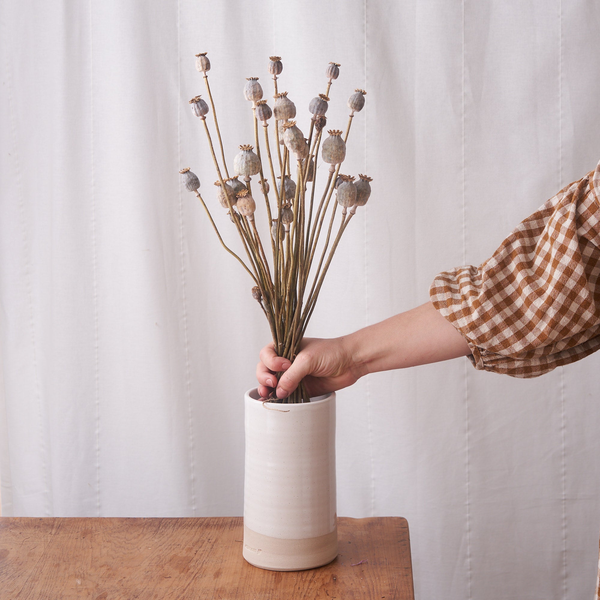 These poppy seed heads are real dried flowers. Dried and preserved flowers are mostly care free and will last indefinitely. They should be kept in a vase without water. The main factors that effect them are light or humidity. Direct sunlight can cause flowers to fade, and moisture can be absorbed and make certain flowers "wilt". If they end up getting dusty, we recommend canned air or a blow dryer on a low cool setting.